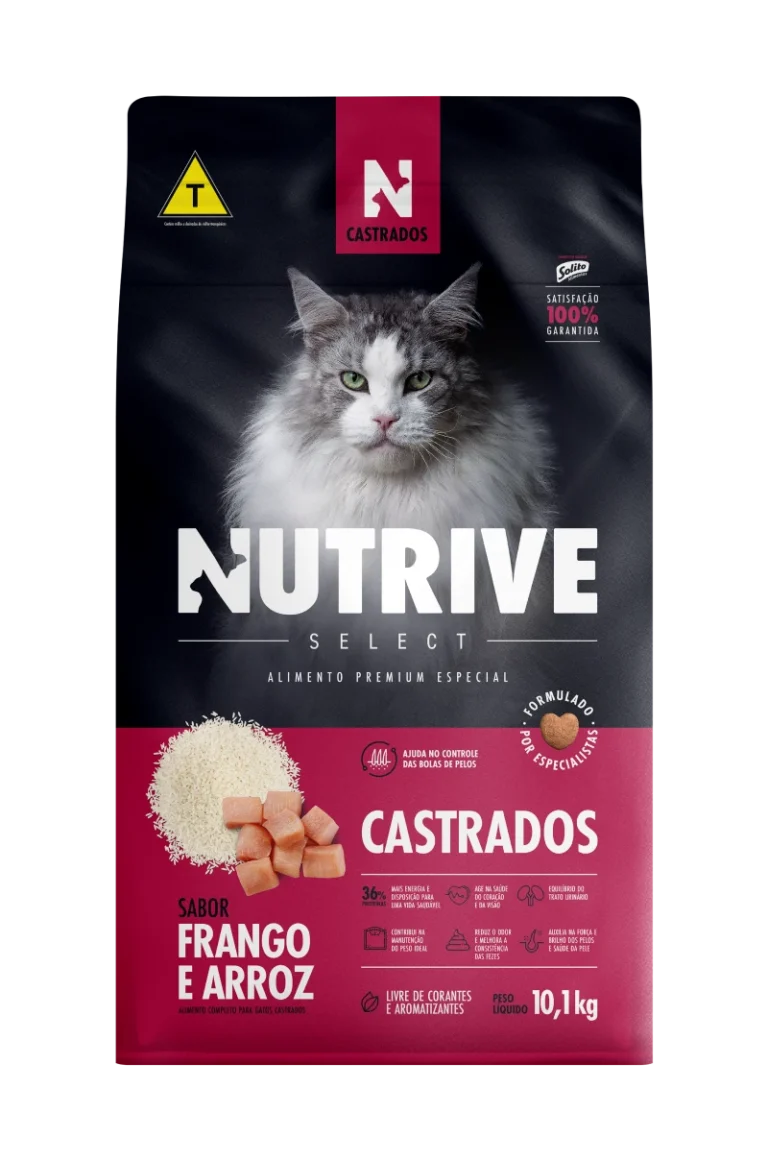 Farinha de vísceras de aves, grão de arroz, grão de milho*, farinha de torresmo, farelo de glúten de milho 60*, farelo de arroz, óleo de aves, óleo de peixe, polpa desidratada de beterraba (1%), levedura de cerveja inativada desidratada, hidrolisado de fígado de suínos, extrato de yucca (0,020%), zeólita (0,50%), cloreto de sódio (sal comum), cloreto de colina, cloreto de potássio, L-carnitina, taurina, DL-metionina, L-lisina, vitamina C (ácido ascórbico monofosfatado), premix vitamínico mineral (vitamina A, vitamina D3, vitamina E, vitamina K3, vitamina B1, vitamina B2, vitamina B6, vitamina B12, niacina, ácido pantotênico, ácido fólico, biotina, sulfato de cobre, sulfato de ferro, iodato de cálcio, sulfato de manganês, selenito de sódio, sulfato de zinco, cobre aminoácido quelato, ferro aminoácido quelato, manganês aminoácido quelato, selênio aminoácido quelato, zinco aminoácido quelato), aditivo regulador de acidez, aditivo prebiótico (parede celular de levedura), sorbato de potássio, antioxidantes (BHA e BHT).